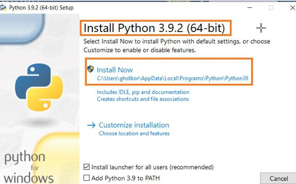 點選“下載Python <版本>”按鈕。下載完成後,Python可執行檔案將儲存到我們的系統中。點選此檔案,將開啟Python安裝頁面。然後,點選立即安裝。