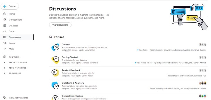 Kaggle 上的一個有用功能是其 討論版塊。資料科學和機器學習愛好者在這裡聚集在一起討論不同的主題。您可以尋求幫助,從他人那裡獲得幫助,並從專業人士那裡獲得關於如何改進模型的可行見解。