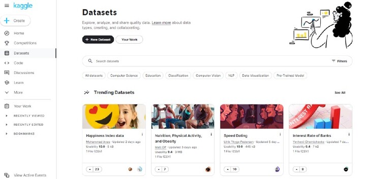 Kaggle 資料集 是在尋找免費的、公開可用的資料集時最受歡迎的資源之一。資料科學和機器學習愛好者可以訪問和使用這些資料集在自己的專案中。Kaggle 上提供了來自各種來源的資料集,包括社交、金融、娛樂、文化和經濟資料。可以透過將這些資料集與 Kaggle 筆記本整合,直接在平臺上開發模型。