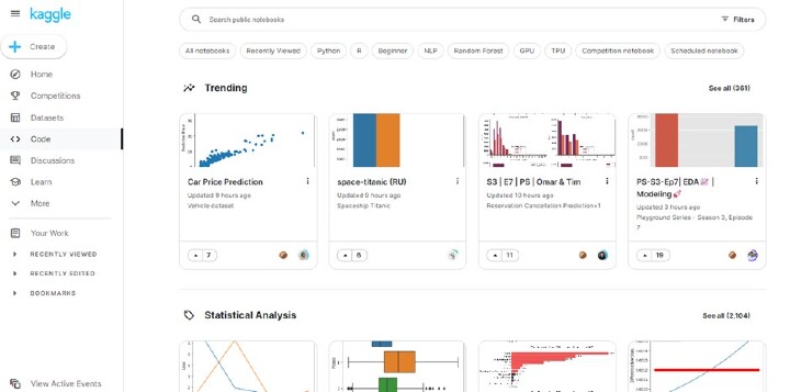 除了學習資源和競賽之外,Kaggle 最強大的功能是能夠隨時建立筆記本。 Kaggle 筆記本 基於 Jupyter 環境構建,支援 R 和 Python 等程式語言,並預裝了機器學習軟體包。這些筆記本可以輕鬆地與平臺上已有的資料集整合,使使用者無需擔心下載即可分析海量資料集。