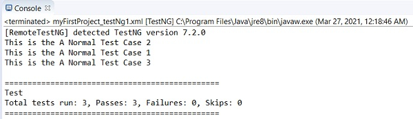import org.testng.annotations.Test; public class TestNGP { @Test (priority = 2) public void testCase1() { System.out.println("This is the A Normal Test Case 1"); } @Test (priority = 1) public void testCase2() { System.out.println("This is the A Normal Test Case 2"); } @Test (priority = 3) public void testCase3() { System.out.println("This is the A Normal Test Case 3"); } }