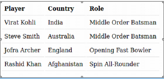 <!DOCTYPE html> <html> <head> <title> Access tr element </title> <style type="text/css"> th, td { padding: 8px; text-align: left; border-bottom: 1px solid #ccc; } </style> </head> <body> <table id="my_table"> <tr> <th>Player</th> <th>Country</th> <th>Role</th> </tr> <tr> <td>Virat Kohli</td> <td>India</td> <td>Middle Order Batsman</td> </tr> <tr> <td>Steve Smith</td> <td>Australia</td> <td>Middle Order Batsman</td> </tr> <tr> <td>Jofra Archer</td> <td>England</td> <td>Opening Fast Bowler</td> </tr> <tr> <td>Rashid Khan</td> <td>Afghanistan</td> <td>Spin All-Rounder</td> </tr> </table> </body> </html>