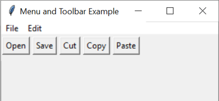 接下來,我們定義 create_toolbar() 函式,該函式負責構建包含按鈕的工具欄並向其分配繫結。在此函式中,我們生成 Frame 小部件,用作按鈕的容器,並使用 config() 方法將其包含在頂級視窗中。然後,我們建立兩個 Button 小部件,“開啟”和“儲存”,並使用 pack() 方法將它們新增到工具欄。最後,透過 bind() 方法為每個按鈕分配繫結。