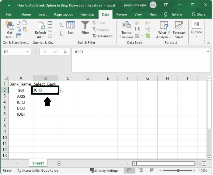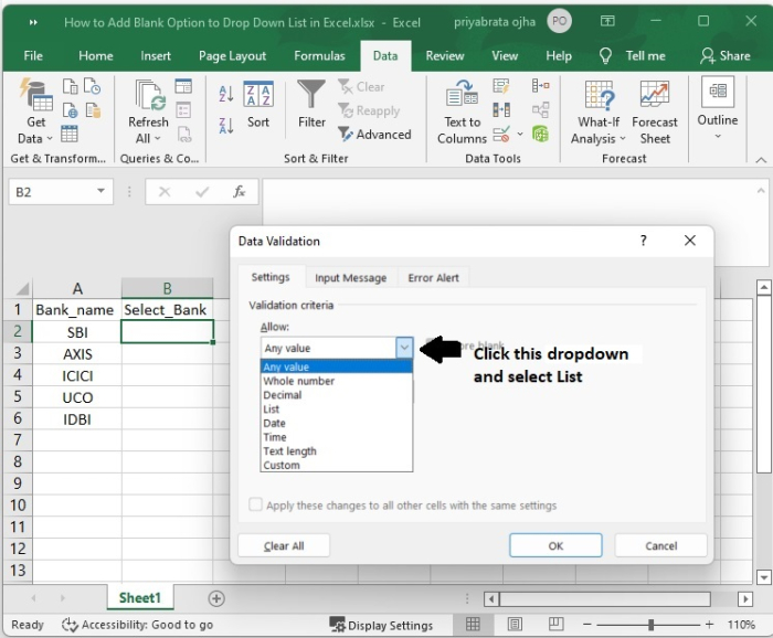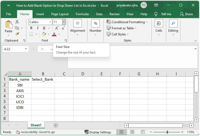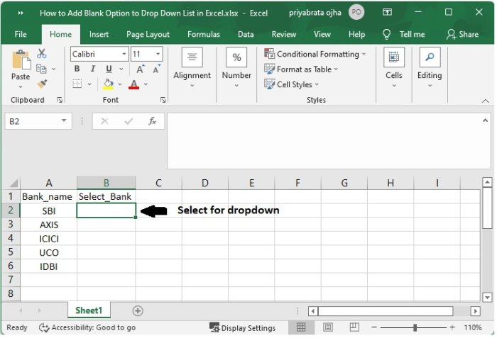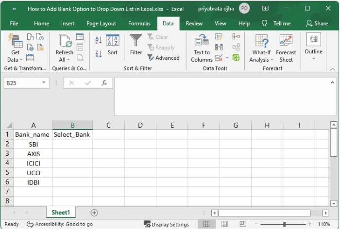 您可能會遇到需要為使用者提供從資料驗證下拉列表中選擇銀行或空值的機會的情況。由於使用者只需按下鍵盤上的 Delete 或 Backspace 鍵即可清除單元格值,因此此修改可以歸類為“錦上添花”。另一方面,我發現這種非常小的改進可以幫助使用者體驗執行得更順暢一些。這是因為使用者可能不確定他們是否允許擁有空白值。