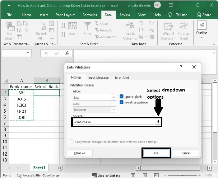 選擇“來源”框並新增下拉選項,然後選擇“確定”按鈕。此時,您應該會看到資料驗證列表中的選項為空。
