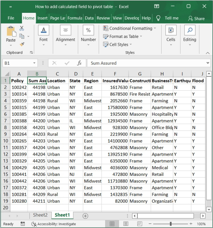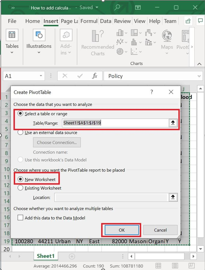 現在,選擇資料範圍 A1:J19。單擊工具欄功能區上的“插入”選項卡,然後選擇“資料透視表”選項以插入所選資料範圍的資料透視表。