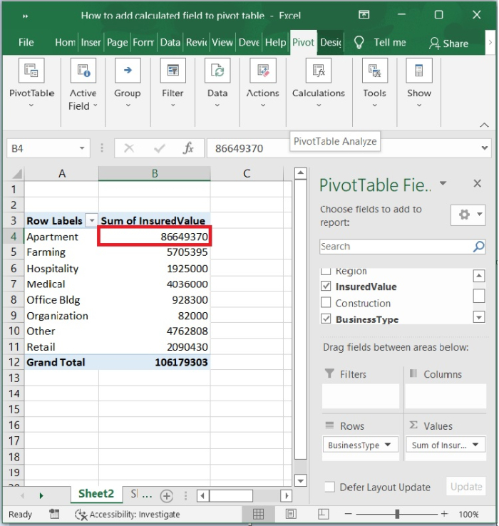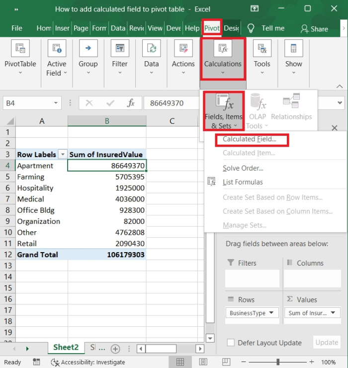 只需選擇要編輯的資料透視表中的欄位並單擊它。然後選擇“資料透視表分析”選項,然後單擊“計算”選項並導航到“欄位、專案和集合”選項卡。之後,將出現一系列選項;您只需單擊“計算欄位”即可。