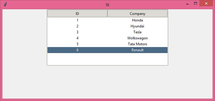 Treeview 視窗小部件中資料的索引從 0 開始。因此,為了避免計算第一列,我們需要使用show=heading引數。讓我們建立一個應用程式來顯示汽車製造商的“ID”和“公司”兩列表格。對於每一列,將有一些資料可以使用insert()方法插入。