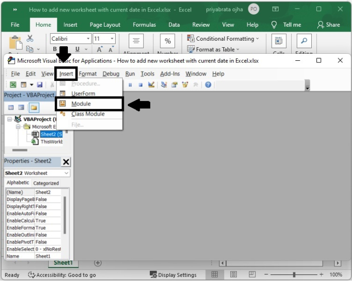 要訪問VBA編輯器,請轉到“插入”選單並選擇“模組”。