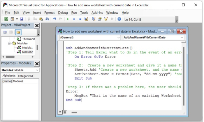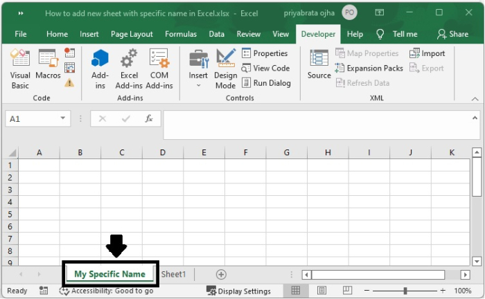 Sub AddAndNameWithSpecificName() 'Step 1: Tell Excel what to do in the event of an error. On Error GoTo Error 'Step 2: Create a new worksheet and give it a name that is easily identifiable. Sheets.Add.Name = "My Specific Name" 'Create a new worksheet and call it "My Specific Name," then replace "My New Sheet" with your own name.. Exit Sub 'Step 3: If there was a problem here, the user should be informed. Error: MsgBox "That is the name of an existing Worksheet in the spreadsheet." End Sub