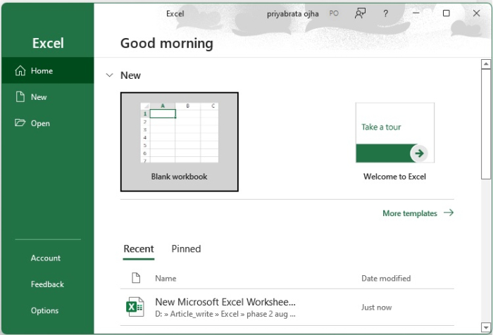 首次啟動Microsoft Excel時,將顯示一個選單,其中提供了多個工作表的選項,如下所示。