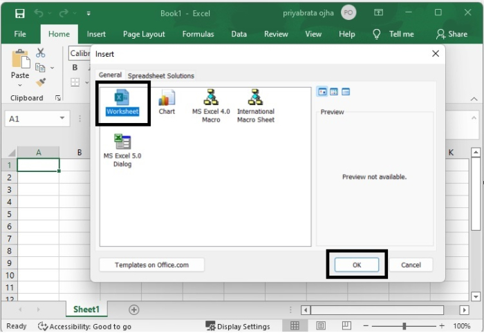 您將看到一個新的對話框出現在螢幕上,您可以在其中選擇新增新工作表的選項。