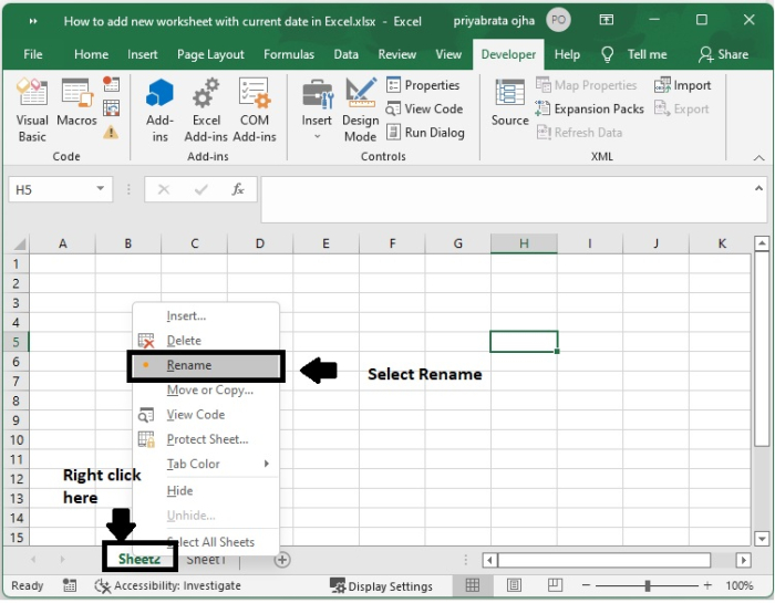 您可以透過右鍵單擊工作表的名稱並從對話方塊中選擇“重新命名”選項來為Excel工作表重新命名,如下面的圖片所示。