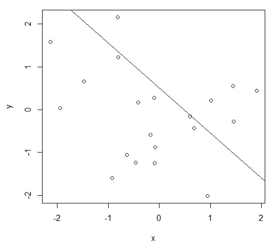 > x<-round(rnorm(20),2) > y<-round(rnorm(20),2) > plot(x,y) > abline(a=0.51,b=-1.05)