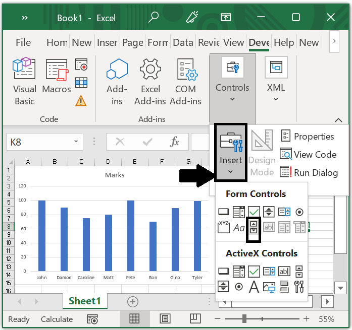 現在,您需要將捲軸插入到Excel工作簿中,為此,請轉到**開發工具 > 插入 > 捲軸**。