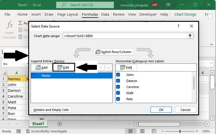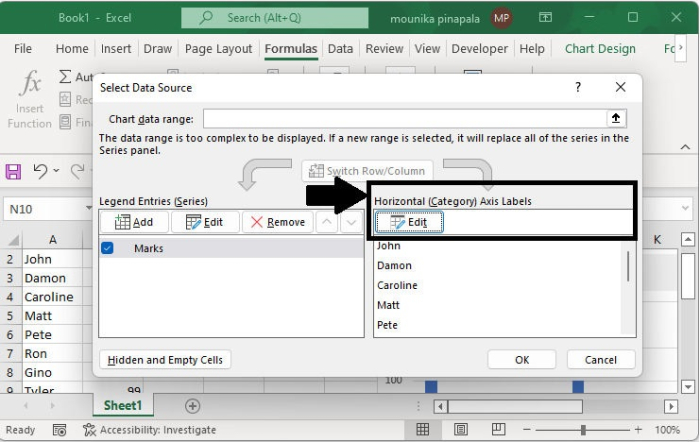 現在單擊**確定**返回到之前的對話方塊,在**選擇資料來源**對話方塊中,單擊水平(分類)軸標籤下的編輯按鈕,在軸標籤對話方塊中,將**=Sheet1!Name**輸入軸標籤範圍欄位。