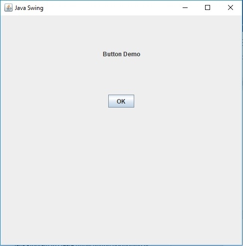 package my; import java.awt.*; import java.awt.event.*; import javax.swing.*; public class SwingDemo { private JFrame frame; private JLabel headerLabel; private JLabel statusLabel; private JPanel controlPanel; public SwingDemo(){ prepareGUI(); } public static void main(String[] args){ SwingDemo swingControlDemo = new SwingDemo(); swingControlDemo.showButtonDemo(); } private void prepareGUI(){ frame = new JFrame("Java Swing"); frame.setSize(500,500); frame.setLayout(new GridLayout(3, 1)); frame.addWindowListener(new WindowAdapter() { public void windowClosing(WindowEvent windowEvent){ System.exit(0); } }); headerLabel = new JLabel("", JLabel.CENTER); statusLabel = new JLabel("",JLabel.CENTER); statusLabel.setSize(350,100); controlPanel = new JPanel(); controlPanel.setLayout(new FlowLayout()); frame.add(headerLabel); frame.add(controlPanel); frame.add(statusLabel); frame.setVisible(true); } private void showButtonDemo(){ headerLabel.setText("Button Demo"); JButton okButton = new JButton("OK"); okButton.addActionListener(new ActionListener() { public void actionPerformed(ActionEvent e) { statusLabel.setText("Ok Button is clicked here"); } }); controlPanel.add(okButton); frame.setVisible(true); } }
