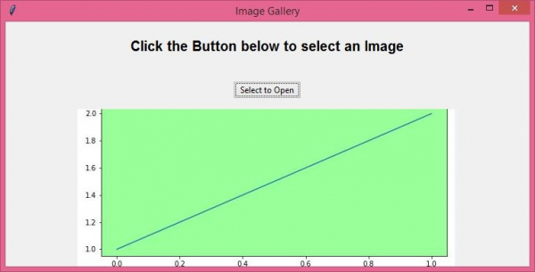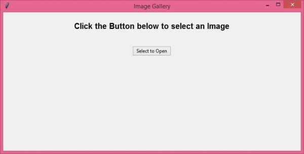 #Import the Tkinter library from tkinter import * from tkinter import ttk from tkinter import filedialog from PIL import Image, ImageTk #Create an instance of Tkinter frame win= Tk() #Define the geometry win.geometry("750x350") win.title("Image Gallery") def select_file(): path= filedialog.askopenfilename(title="Select an Image", filetype=(('image files','*.jpg'),('all files','*.*'))) img= Image.open(path) img=ImageTk.PhotoImage(img) label= Label(win, image= img) label.image= img label.pack() #Create a label and a Button to Open the dialog Label(win, text="Click the Button below to select an Image", font=('Caveat 15 bold')).pack(pady=20) button= ttk.Button(win, text="Select to Open", command= select_file) button.pack(ipadx=5, pady=15) win.mainloop()