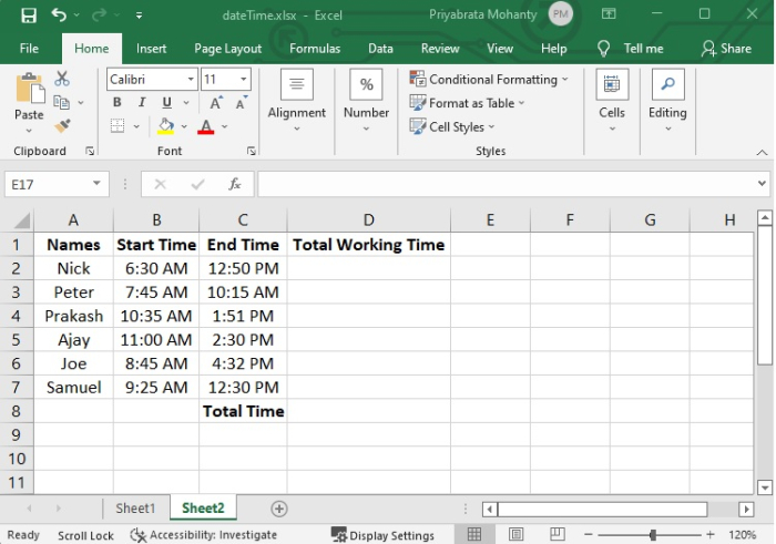 在我們的示例中,我們記錄了專案中一些員工的工作開始時間和結束時間,我們將計算每個員工的工作時間。