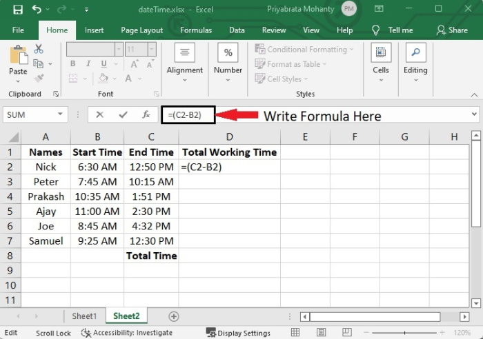 在這個例子中,我們將使用以下公式來計算每個員工的總工作時間。