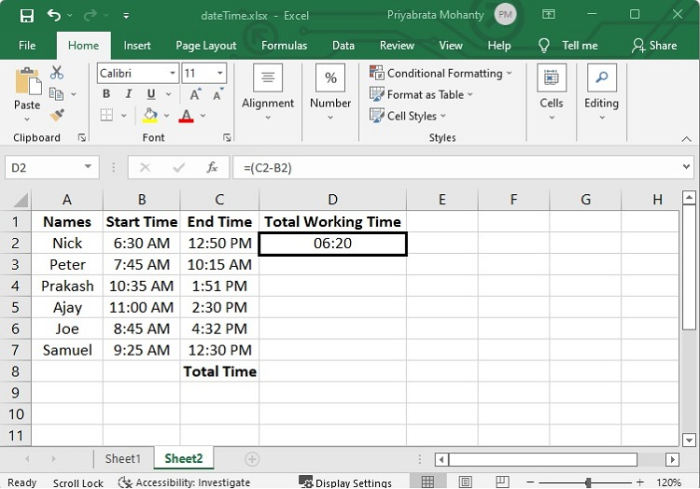 考慮一下您需要將兩個單獨的時間值加在一起才能得到結果的情況。或者,為了計算在專案上花費的總時間,您需要從另一個時間值中減去一個時間值。讓我們舉個例子來了解如何在Excel中新增和減去時間。