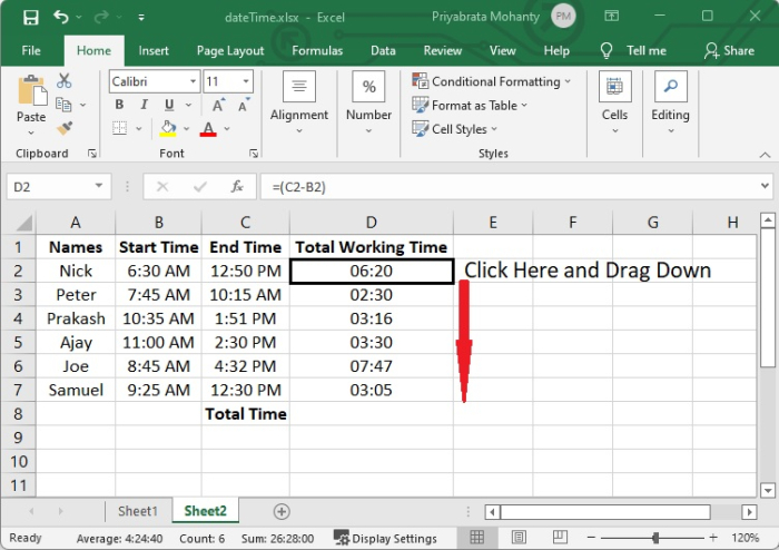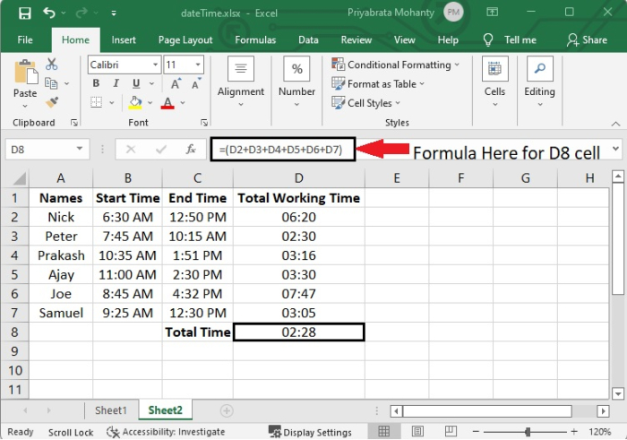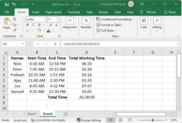 假設有一種情況,我們需要知道完成專案所需的總時間。因此,我們必須新增每個員工的工作時間。讓我們看看如何計算這些。