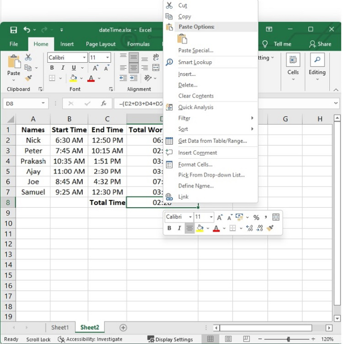 按Enter鍵後,您將看到員工的總工作時間。