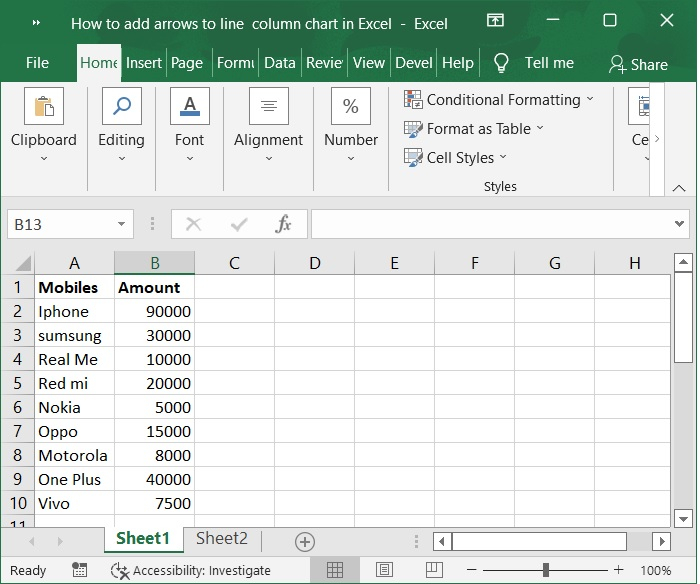 首先,我們必須在Excel工作表中以列格式建立圖表樣本資料,如下面的螢幕截圖所示。