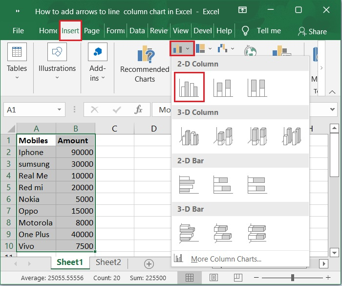 然後,選擇A1:B10範圍內的單元格。單擊“插入”工具欄,然後選擇“柱狀圖>二維柱狀圖”以顯示上述樣本資料的圖表。以下是相同的螢幕截圖。