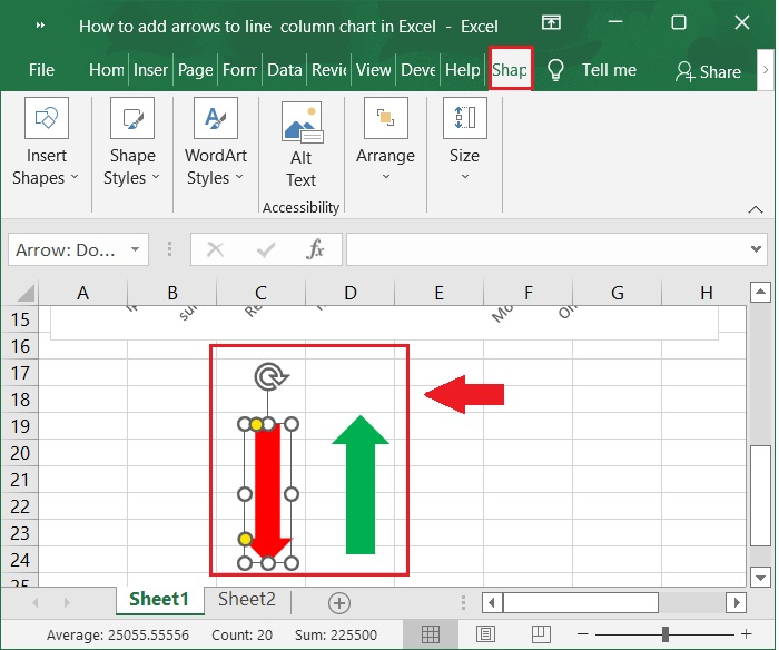 透過選擇“插入>形狀”,然後從“塊箭頭”部分選擇“向上箭頭”或“向下箭頭”,將箭頭形狀插入到工作表的空白部分。
