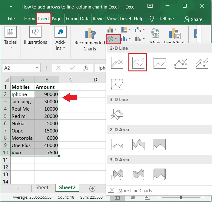 然後,選擇A1:B10範圍內的單元格。單擊“插入”工具欄,然後選擇“圖表>線形圖>二維線形圖”以顯示線形圖。以下是相同的螢幕截圖。