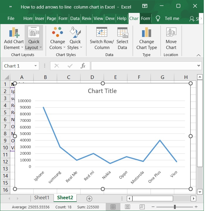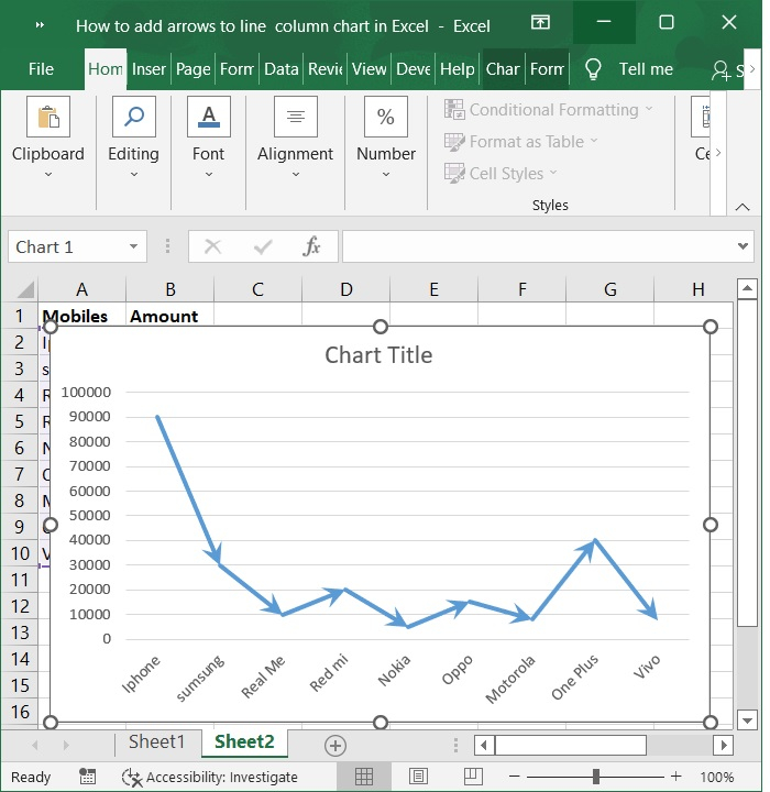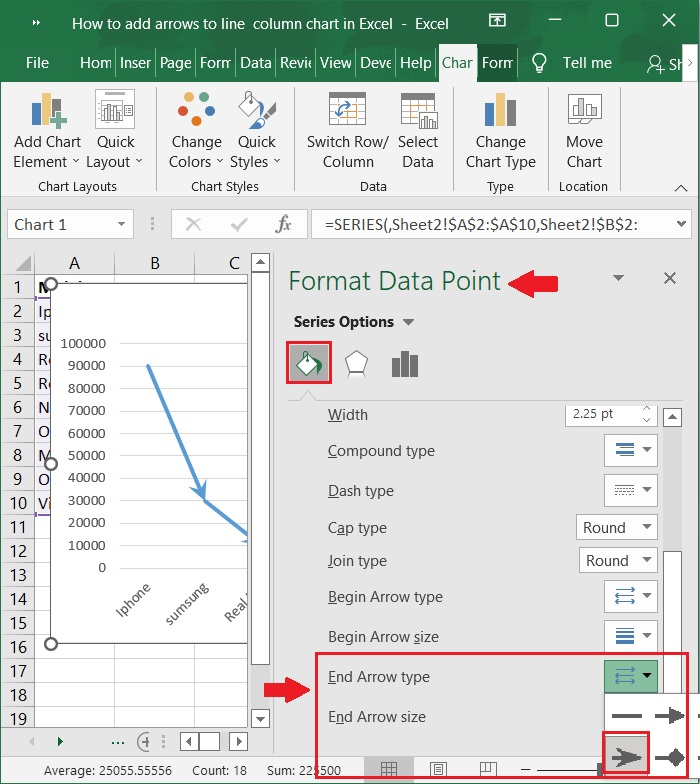 您還可以向線形圖新增箭頭以顯示資料變化情況。請按照以下步驟操作。