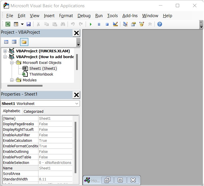 開啟一個 Excel 表格,然後按 Alt 和 F11 鍵(Alt+F11) 以開啟 Microsoft Visual Basic for Application 視窗。請參閱下圖。