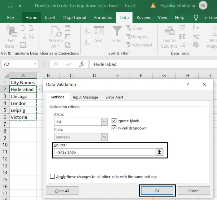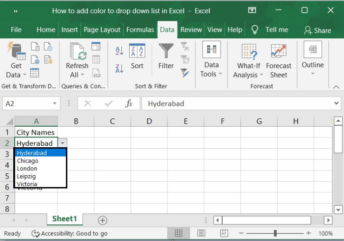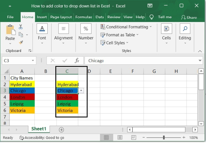 例如,我建立了一個城市名稱的下拉列表;當我選擇“海德拉巴”時,我希望單元格自動變為黃色,當我選擇“芝加哥”時,我希望單元格變為藍色,如下面的螢幕截圖所示。