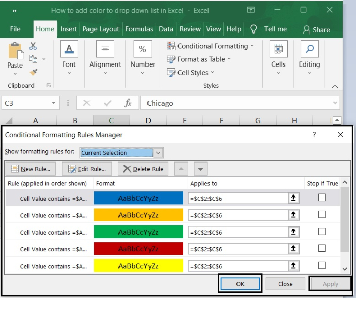 在本教程中,我們透過一個示例解釋瞭如何使用條件格式設定透過建立和管理條件格式規則來為下拉列表新增顏色。