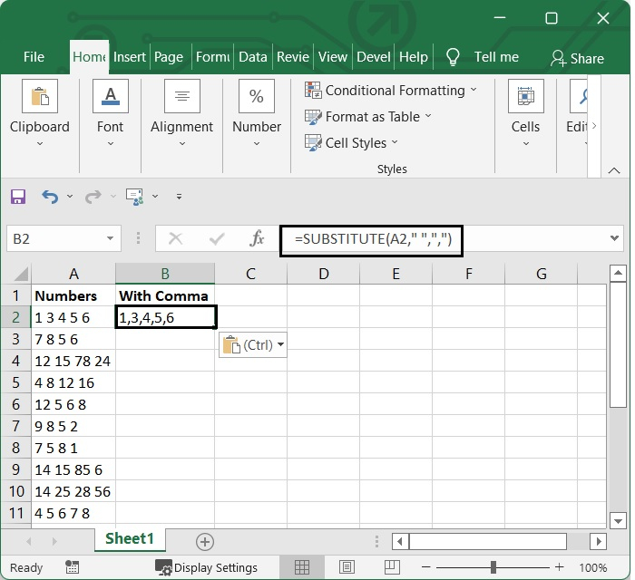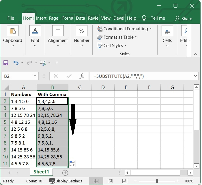 在上面的公式中,SUBSTITUTE 函式將數字之間的所有空格替換為逗號。