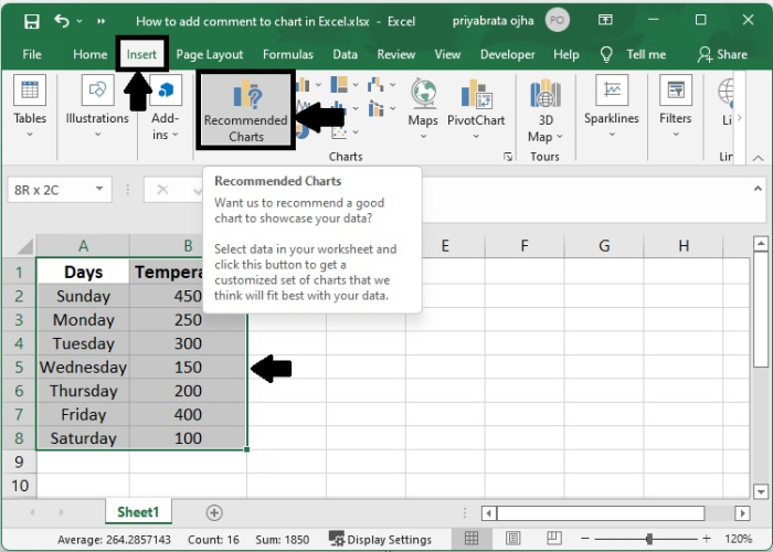 選擇將用於建立圖表的資料後,單擊“插入”選項卡下的“推薦圖表”按鈕。
