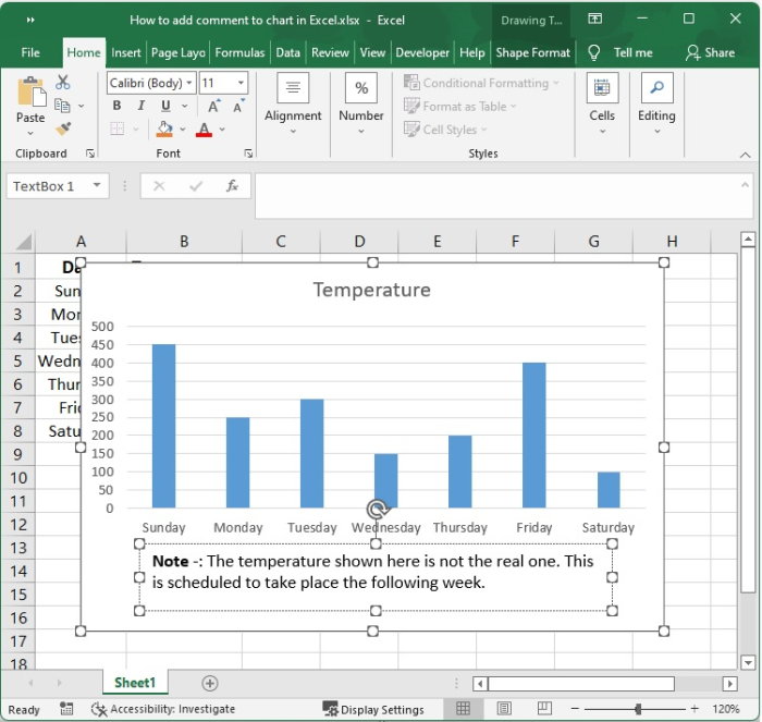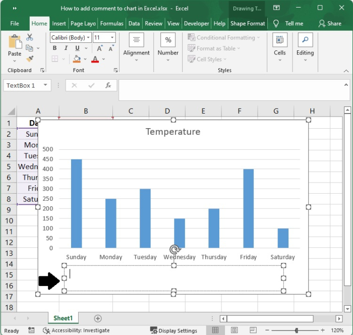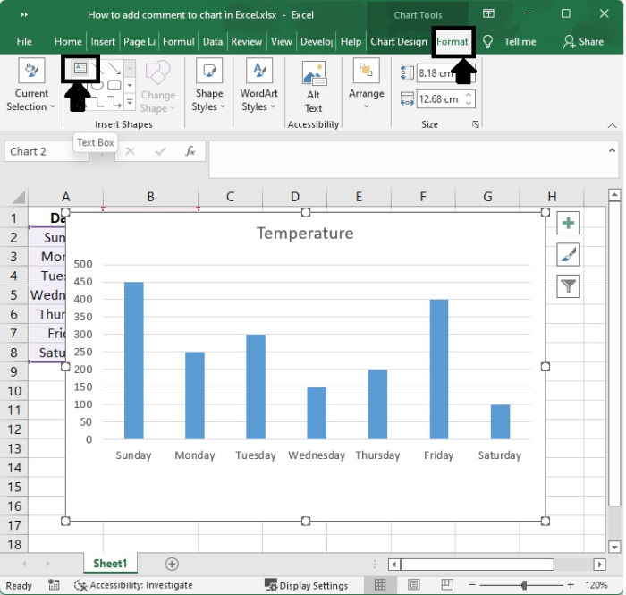 只需單擊圖表即可調出圖表工具。之後,在“格式”選項卡的“插入形狀”部分中選擇“文字框”選項。
