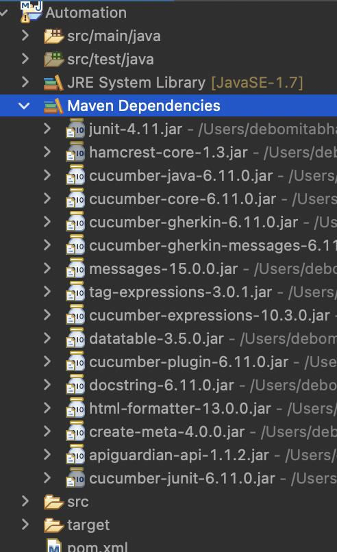 步驟 4− 單擊專案中的 Maven Dependencies 資料夾。我們透過 Maven 獲得的所有與 Cucumber 相關的依賴項都應可見。