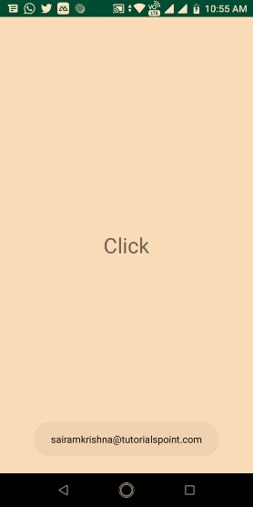 <?xml version = "1.0" encoding = "utf-8"?> <LinearLayout xmlns:android = "http://schemas.android.com/apk/res/android" android:layout_width = "match_parent" android:gravity = "center" android:layout_height = "match_parent"> <TextView android:id = "@+id/click" android:layout_width = "wrap_content" android:textSize = "30sp" android:layout_height = "wrap_content" android:text = "Click"/> </LinearLayout>