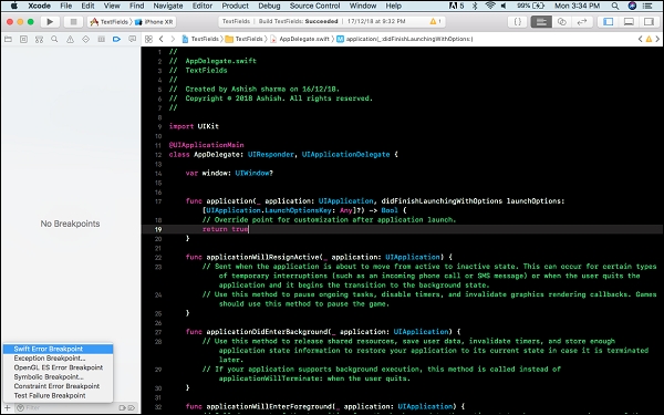 有時在編寫 iOS 應用程式或任何其他應用程式時,我們需要測試多種情況並除錯應用程式中已知和未知的錯誤。在程式碼中某些位置,我們希望應用程式停止,以便了解該點處某些變數的值並修復該錯誤。在我們學習如何新增斷點之前,讓我們先了解