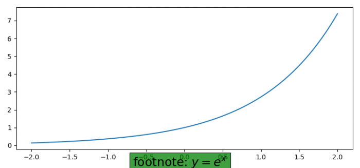 plt.figtext(0.5, 0.01, "footnote: $y=e^{x}$", ha="center", fontsize=18, bbox={"facecolor": "green", "alpha": 0.75, "pad": 5})