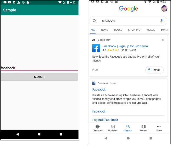 import androidx.appcompat.app.AppCompatActivity; import android.app.SearchManager; import android.content.Intent; import android.os.Bundle; import android.view.View; import android.widget.Button; import android.widget.EditText; public class MainActivity extends AppCompatActivity { EditText editText; Button btnSearch; @Override protected void onCreate(Bundle savedInstanceState) { super.onCreate(savedInstanceState); setContentView(R.layout.activity_main); editText = findViewById(R.id.editText); btnSearch = findViewById(R.id.btnSearch); btnSearch.setOnClickListener(new View.OnClickListener() { @Override public void onClick(View v) { Intent intent = new Intent(Intent.ACTION_WEB_SEARCH); String term = editText.getText().toString(); intent.putExtra(SearchManager.QUERY, term); startActivity(intent); } }); } }
