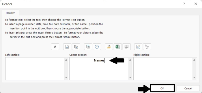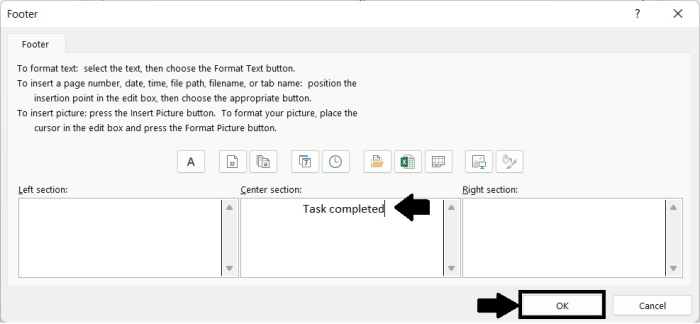 以同樣的方式,在您需要的位置新增頁尾資訊。在此示例中,頁首資訊位於中間,然後單擊“**確定 > 確定**”。