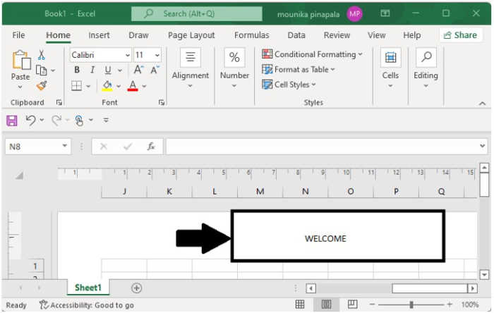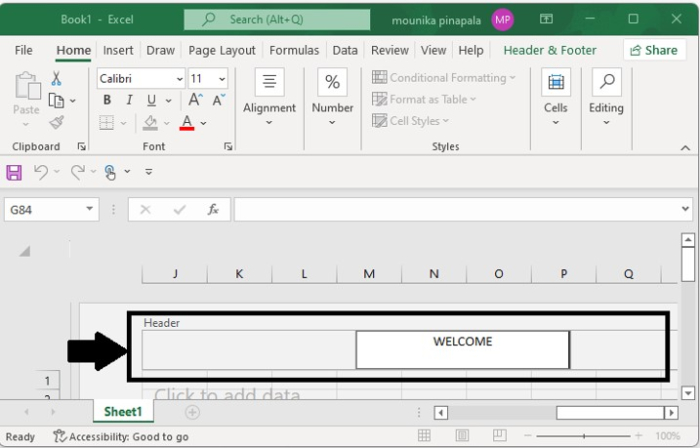 如您所見,在示例中,我們在頁首區域的中間輸入了標題“WELCOME”。