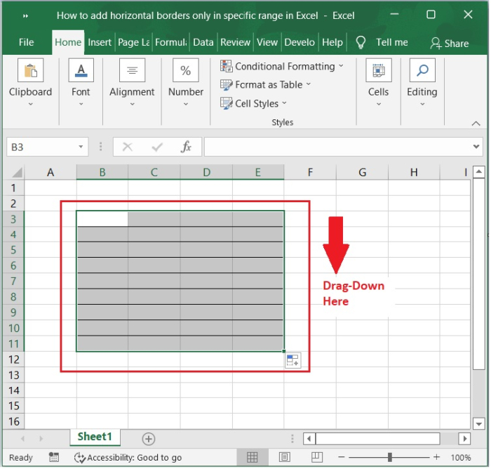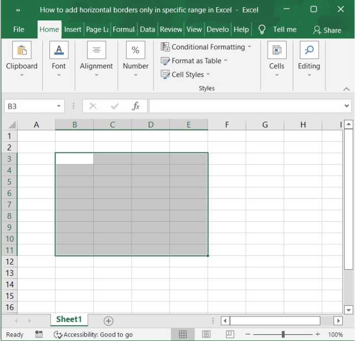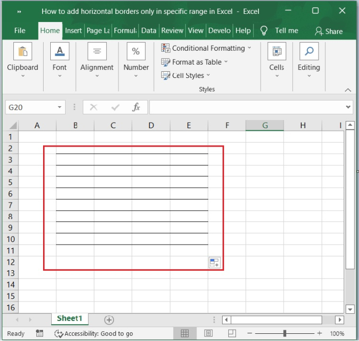 然後,您將注意到僅在 Excel 中的特定範圍內應用了水平邊框,如下面的螢幕截圖所示。