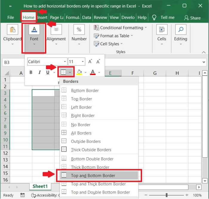 在“開始”選項卡上,選擇“字型”選項。您可以透過單擊“邊框”按鈕旁邊的箭頭,然後從下拉選單中選擇“頂部和底部邊框”來新增頂部和底部邊框。