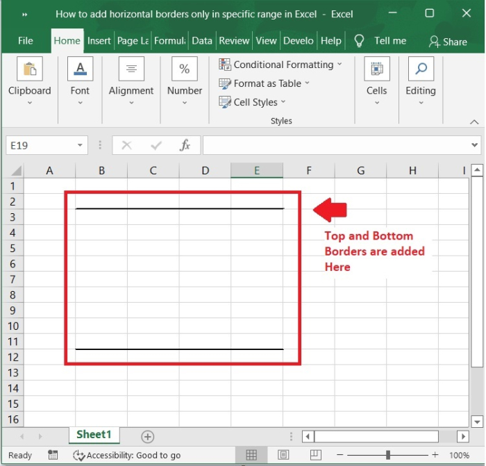 現在,我們將看到頂部和底部邊框已應用於所選單元格範圍,如下面的螢幕截圖所示。