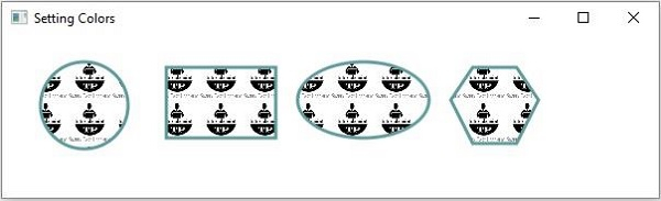 import javafx.application.Application; import javafx.scene.Group; import javafx.scene.Scene; import javafx.scene.image.Image; import javafx.scene.paint.Color; import javafx.scene.paint.ImagePattern; import javafx.stage.Stage; import javafx.scene.shape.Circle; import javafx.scene.shape.Ellipse; import javafx.scene.shape.Polygon; import javafx.scene.shape.Rectangle; public class ImagePatterns extends Application { public void start(Stage stage) { //Drawing a circle Circle circle = new Circle(75.0f, 65.0f, 40.0f ); //Drawing a Rectangle Rectangle rect = new Rectangle(150, 30, 100, 65); //Drawing an ellipse Ellipse ellipse = new Ellipse(330, 60, 60, 35); //Drawing Polygon Polygon poly = new Polygon(410, 60, 430, 30, 470, 30, 490, 60, 470, 100, 430, 100 ); //Creating the pattern Image map = new Image("https://tutorialspoint.tw/images/tp-logo.gif"); ImagePattern pattern = new ImagePattern(map, 20, 20, 40, 40, false); //Setting the pattern circle.setFill(pattern); circle.setStrokeWidth(3); circle.setStroke(Color.CADETBLUE); rect.setFill(pattern); rect.setStrokeWidth(3); rect.setStroke(Color.CADETBLUE); ellipse.setFill(pattern); ellipse.setStrokeWidth(3); ellipse.setStroke(Color.CADETBLUE); poly.setFill(pattern); poly.setStrokeWidth(3); poly.setStroke(Color.CADETBLUE); //Setting the stage Group root = new Group(circle, ellipse, rect, poly); Scene scene = new Scene(root, 600, 150); stage.setTitle("Setting Colors"); stage.setScene(scene); stage.show(); } public static void main(String args[]){ launch(args); } }