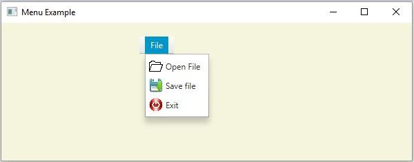 import javafx.application.Application; import javafx.scene.Group; import javafx.scene.Scene; import javafx.scene.control.Menu; import javafx.scene.control.MenuBar; import javafx.scene.control.MenuItem; import javafx.scene.image.ImageView; import javafx.scene.paint.Color; import javafx.stage.Stage; public class MenuItemAddingImages extends Application { public void start(Stage stage) { //Creating image view files ImageView imgView1 = new ImageView("UIControls/open.png"); imgView1.setFitWidth(20); imgView1.setFitHeight(20); ImageView imgView2 = new ImageView("UIControls/Save.png"); imgView2.setFitWidth(20); imgView2.setFitHeight(20); ImageView imgView3 = new ImageView("UIControls/Exit.png"); imgView3.setFitWidth(20); imgView3.setFitHeight(20); //Creating menu Menu fileMenu = new Menu("File"); //Creating menu Items MenuItem item1 = new MenuItem("Open File", imgView1); MenuItem item2 = new MenuItem("Save file", imgView2); MenuItem item3 = new MenuItem("Exit", imgView3); //Adding all the menu items to the menu fileMenu.getItems().addAll(item1, item2, item3); //Creating a menu bar and adding menu to it. MenuBar menuBar = new MenuBar(fileMenu); menuBar.setTranslateX(200); menuBar.setTranslateY(20); //Setting the stage Group root = new Group(menuBar); Scene scene = new Scene(root, 595, 200, Color.BEIGE); stage.setTitle("Menu Example"); stage.setScene(scene); stage.show(); } public static void main(String args[]){ launch(args); } }